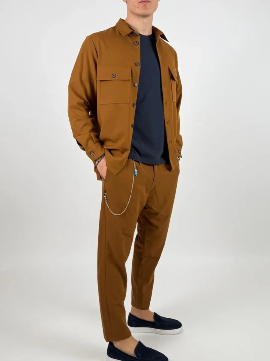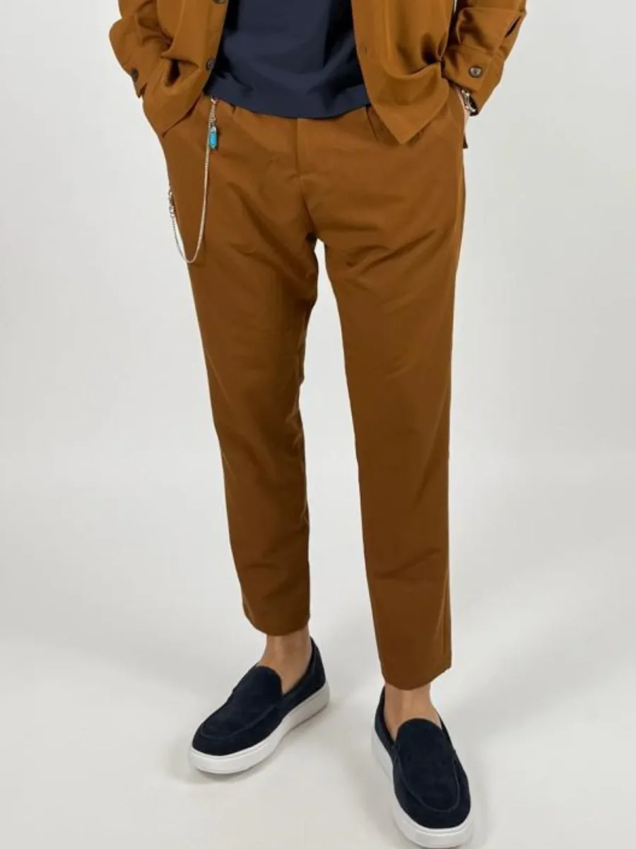 Linee pure e silhouette regolare definiscono questi trousers, arricchiti da una catena decorativa removibile che valorizza il passante in vita. Chiusura frontale con bottone e zip discreti, tasche laterali inserite. Una scelta sofisticata per chi desidera versatilità e stile senza rinunciare a dettagli distintivi.