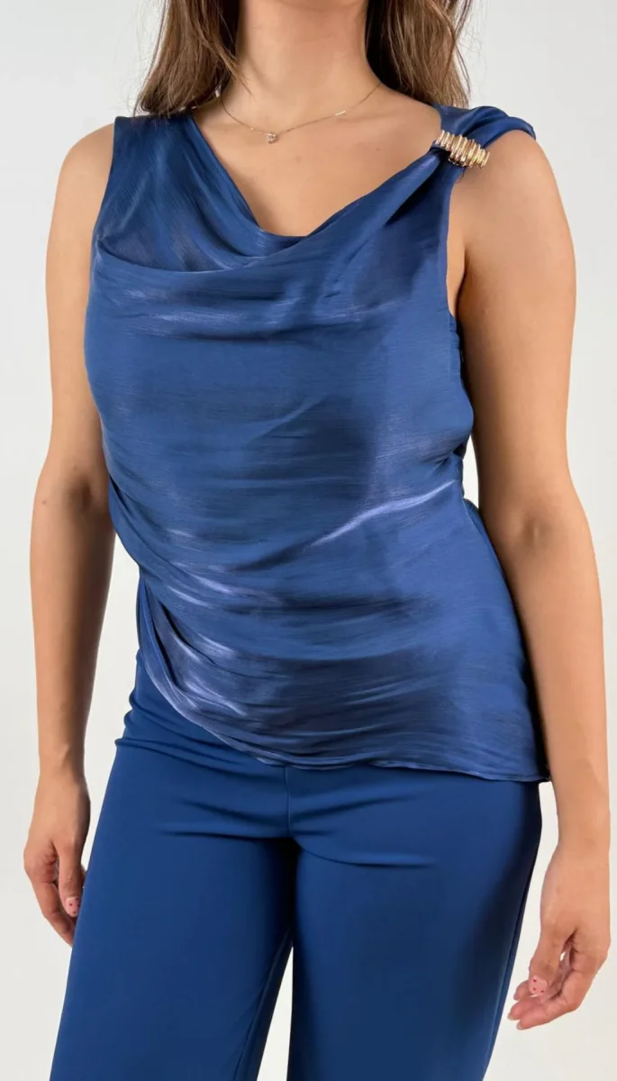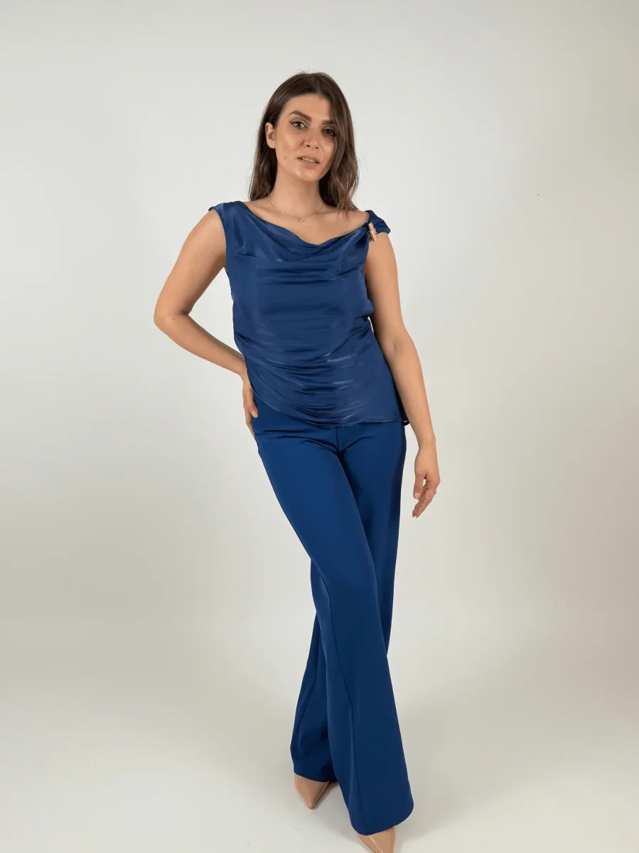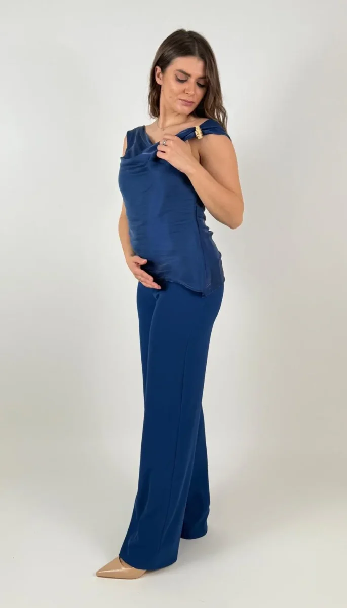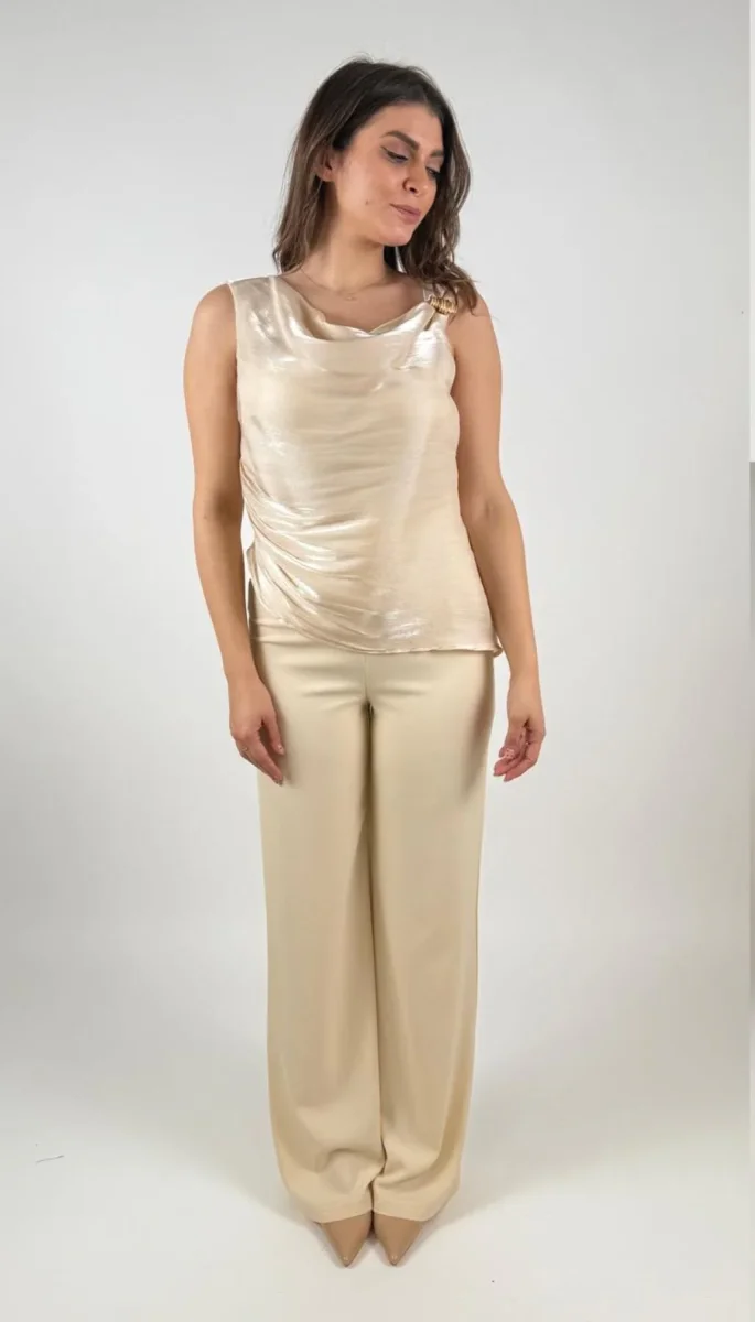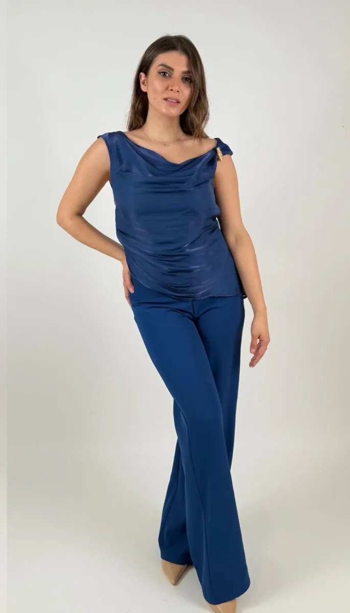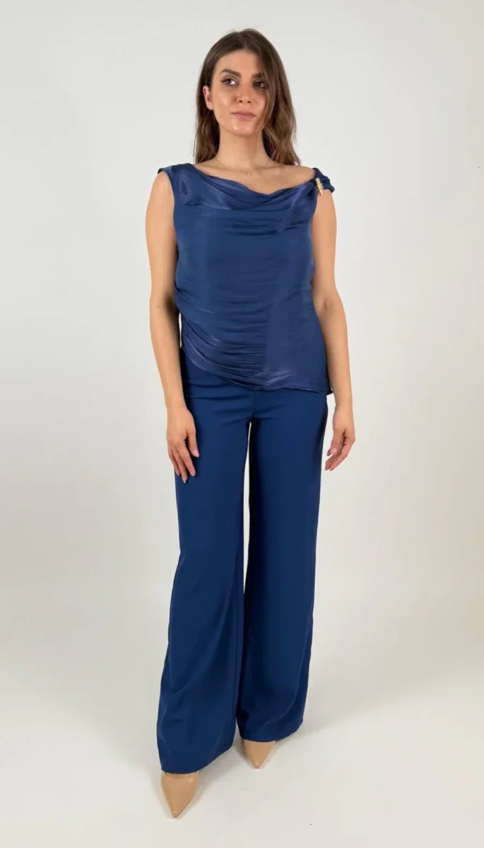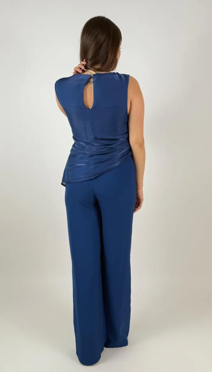 Elegante tuta intera a gamba larga in tessuto fluido e leggermente lucido che scivola sulla silhouette senza segnarla. Scollatura drappeggiata con chiusura gioiello sulla spalla e morbido incrocio asimmetrico in vita. Perfetto per cerimonie, cocktail e feste serali.