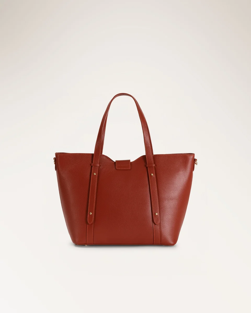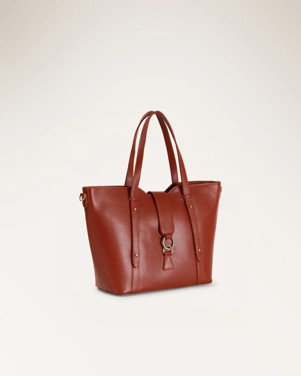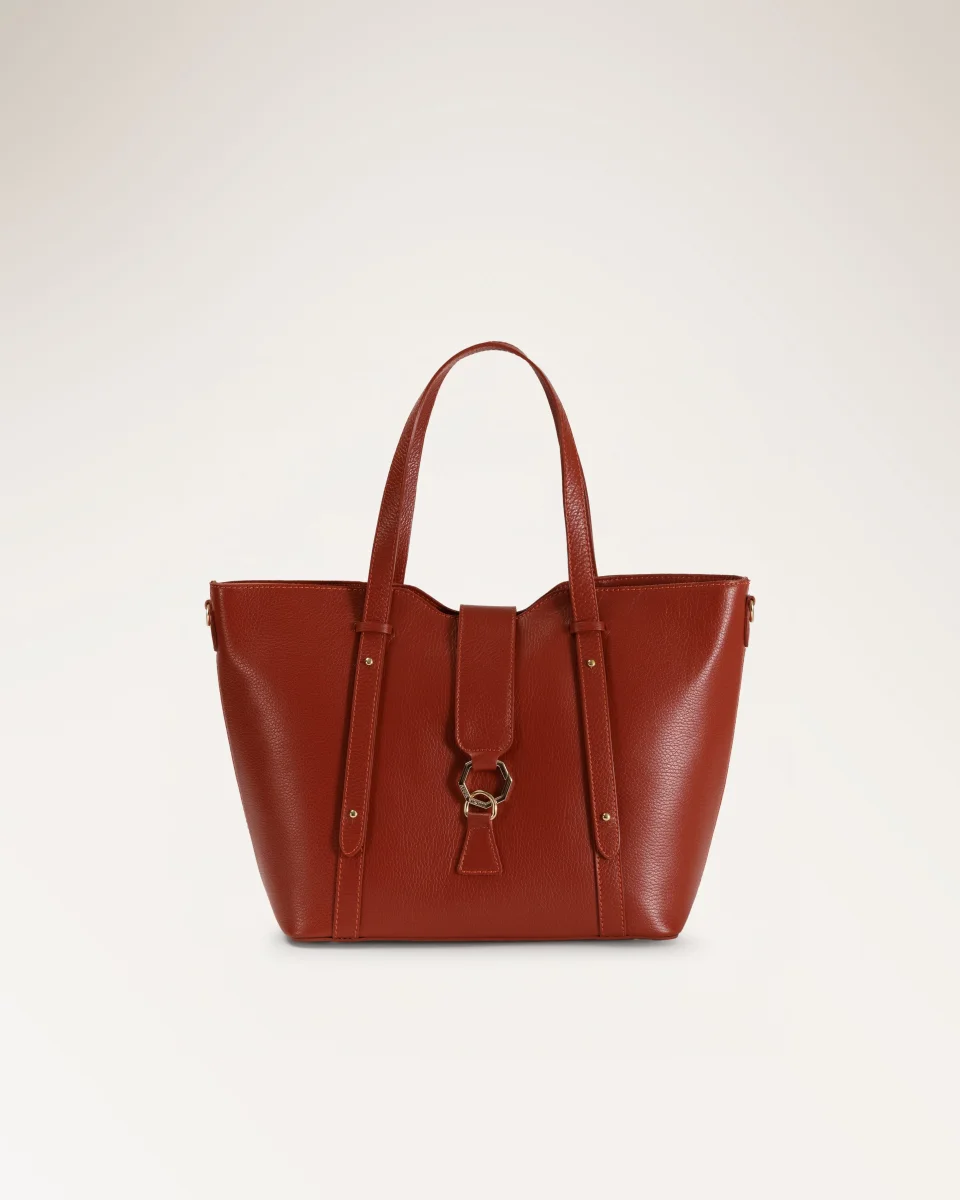 Verla Orange di Anna Virgili. Tote bag in pelle a grana arancione intenso con manici doppi e patta frontale impreziosita da anello esagonale in metallo dorato.