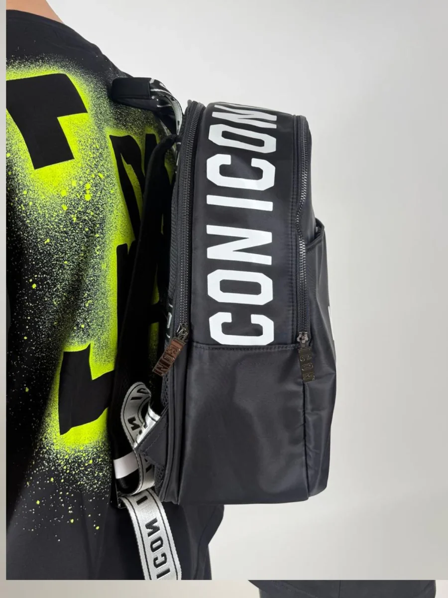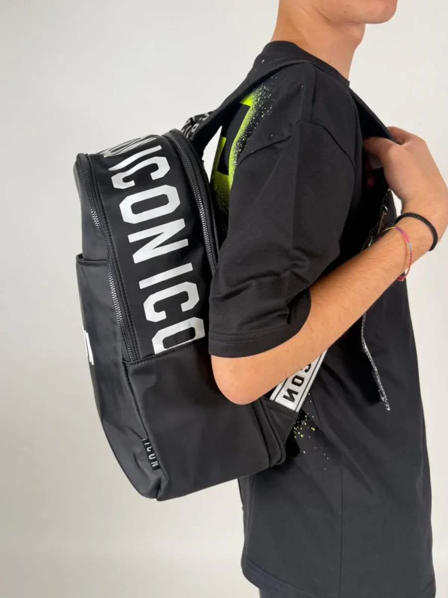 Zaino in total nero con stampa logo brand in bianco. Presente tascone principale con chiusura a zip, tasca sul retro sempre con chiusura a zip, più tasca frontale con chiusura a bottone. L’indossatura è pratica e maneggevole grazie a bretelle brandizzate regolabili. Molto comodo anche lo schienale traspirante. Lo zaino è ideale per occasioni casual/sportive.