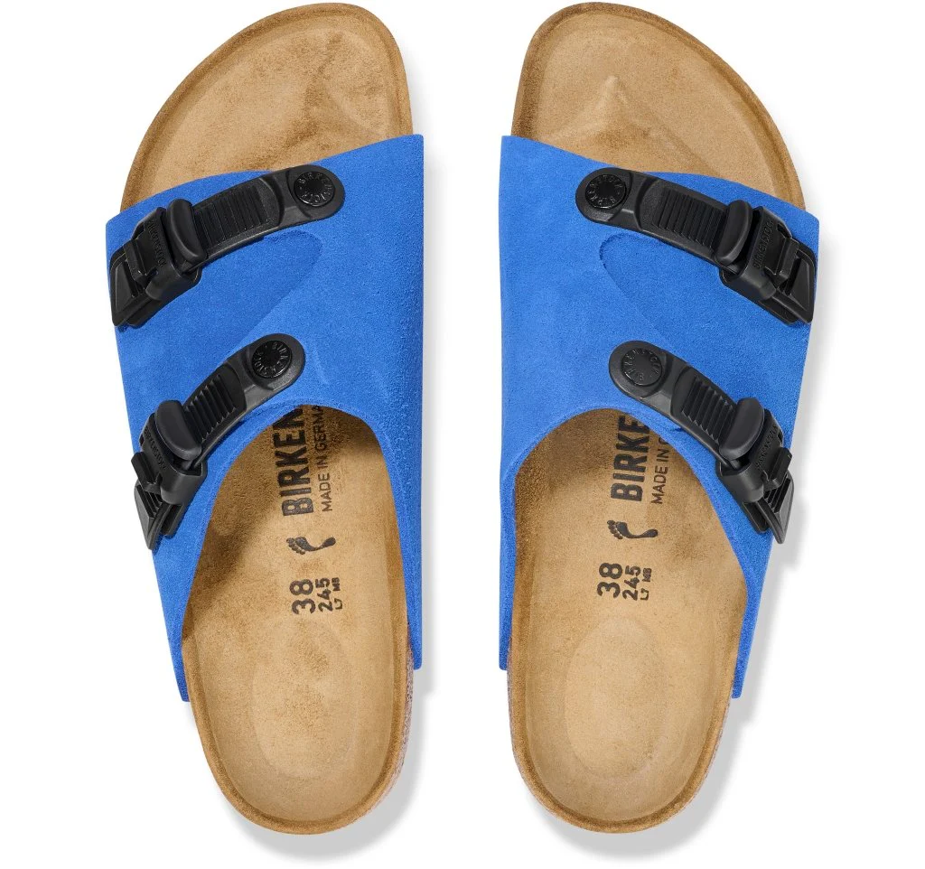 Due in uno! BIRKENSTOCK Zürich unisce la stabilità di una scarpa chiusa alla leggerezza di un sandalo. Qui il modello viene rivisitato in chiave sportiva. Le fibbie ‘ski closure’ total black completano l’aspetto street del sandalo. Al design contribuisce la tomaia in pelle scamosciata particolarmente morbida che abbraccia il piede come una seconda pelle.